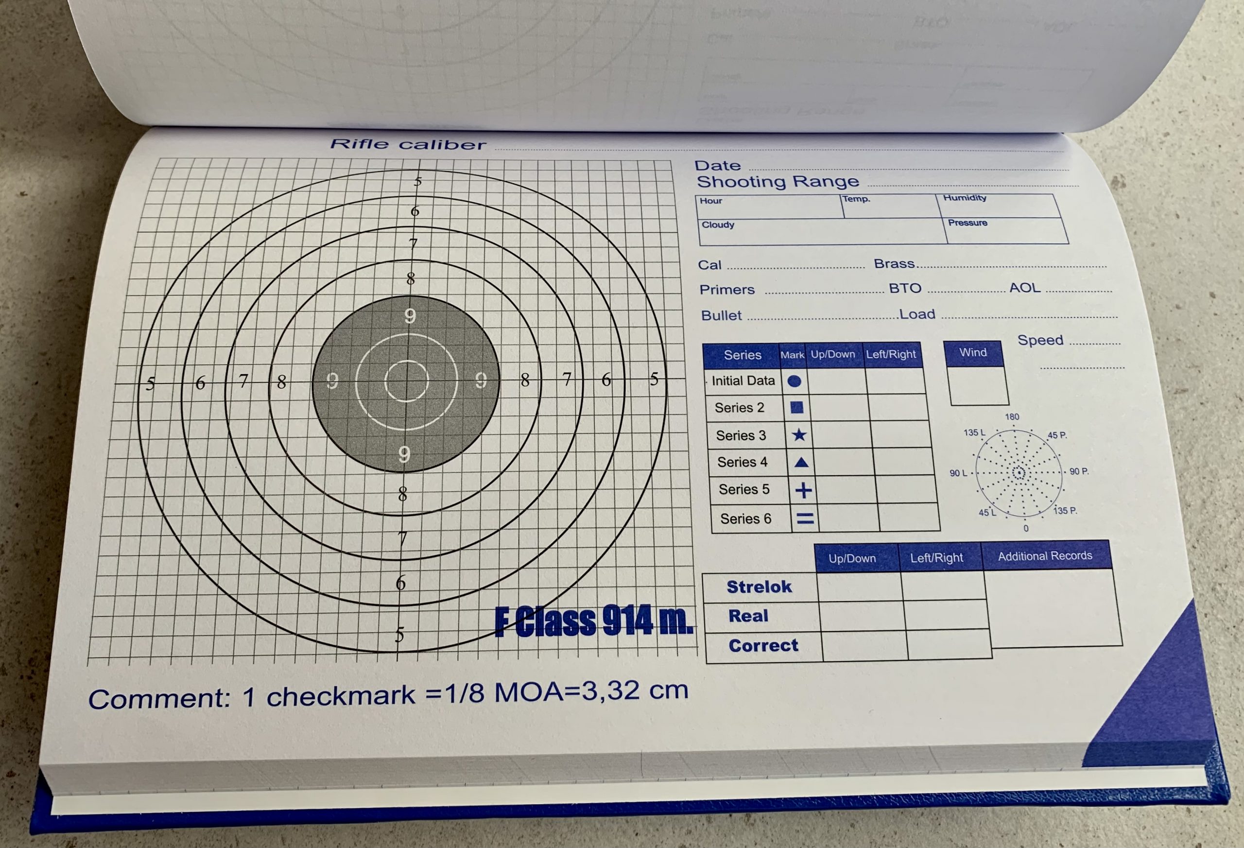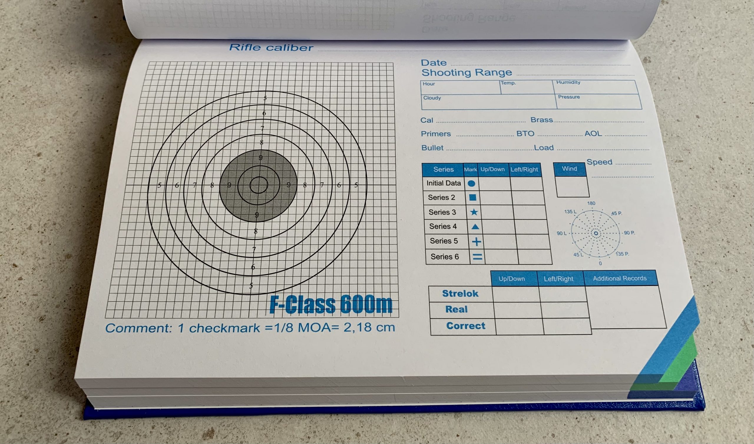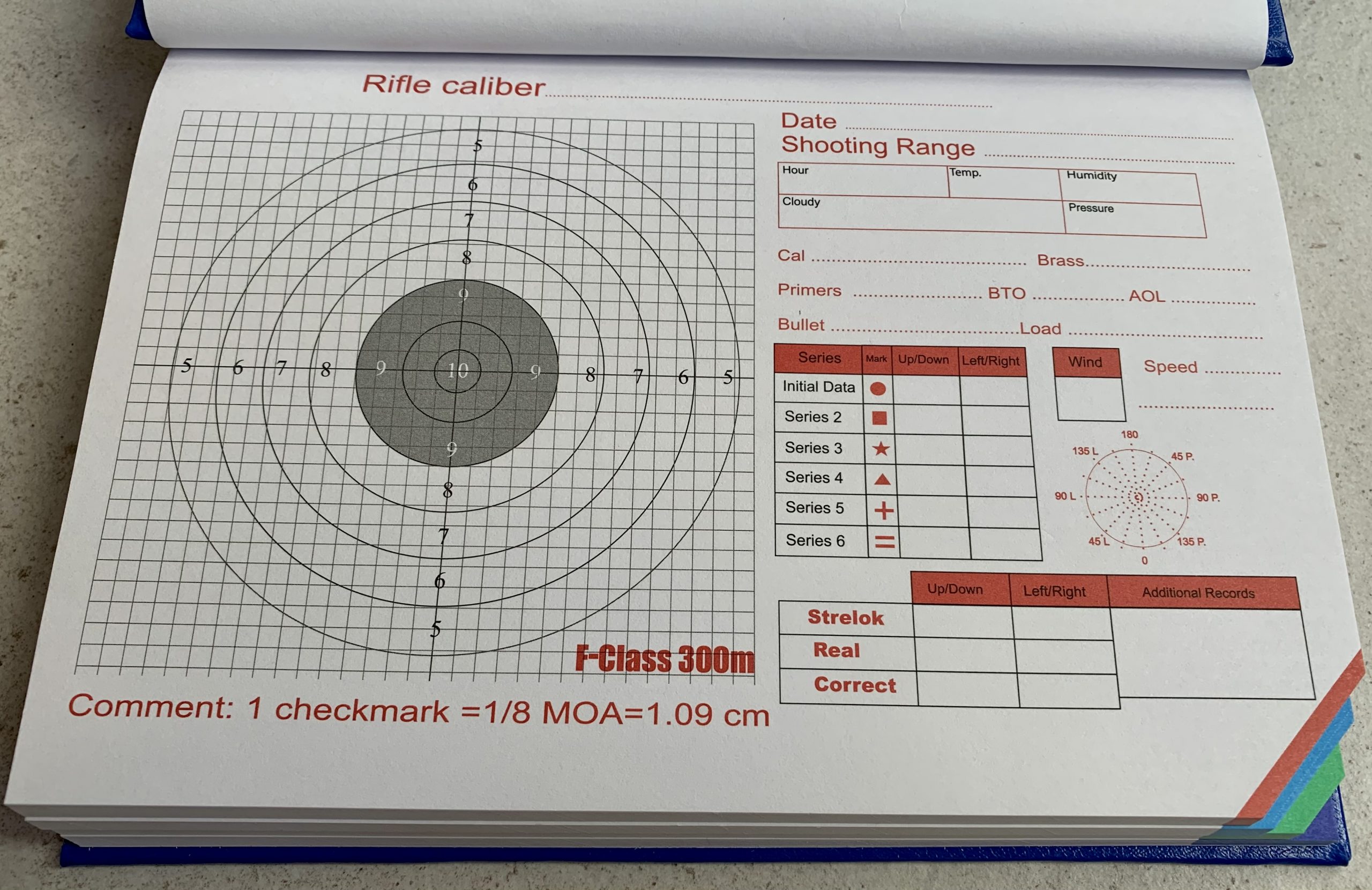 Notatnik – tabele do nanoszenia poprawek , profesjonalny druk, cztery bazowe dystanse 300-600-800 m i 1000y(914m) czytelnie oznaczone kolorami , w 1/8 MOA . Autor Jacek D.